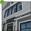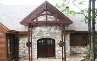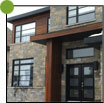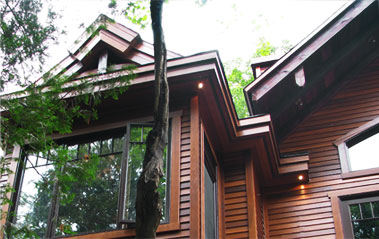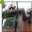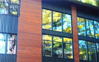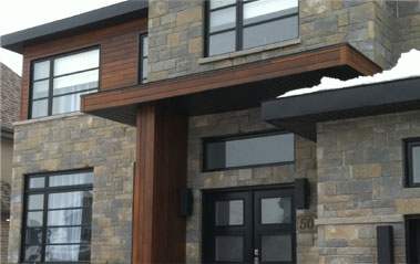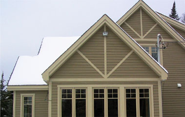 Estérel, Laurentides - Installation du parement de bois torréfié. Fabrication et installation de moulures de coins, des portes et des fenêtres. Les corniches sont faites en bois torréfié de style «V» joints.