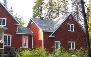 Wenthworth, Laurentides - Installation de bardeaux de cèdre et de moulures de coins, de portes et de fenêtres. Corniches: soffittes en cèdre «V» joints et fascias en acier pré-peint.
