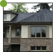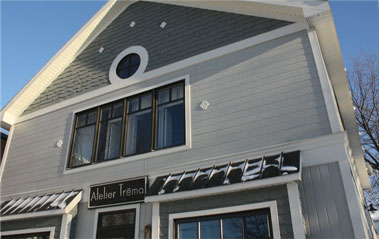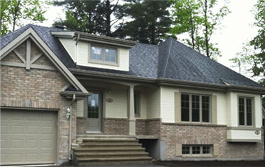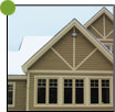 Canexel, du bardeaux de cèdre (pignon) et des moulures en bois